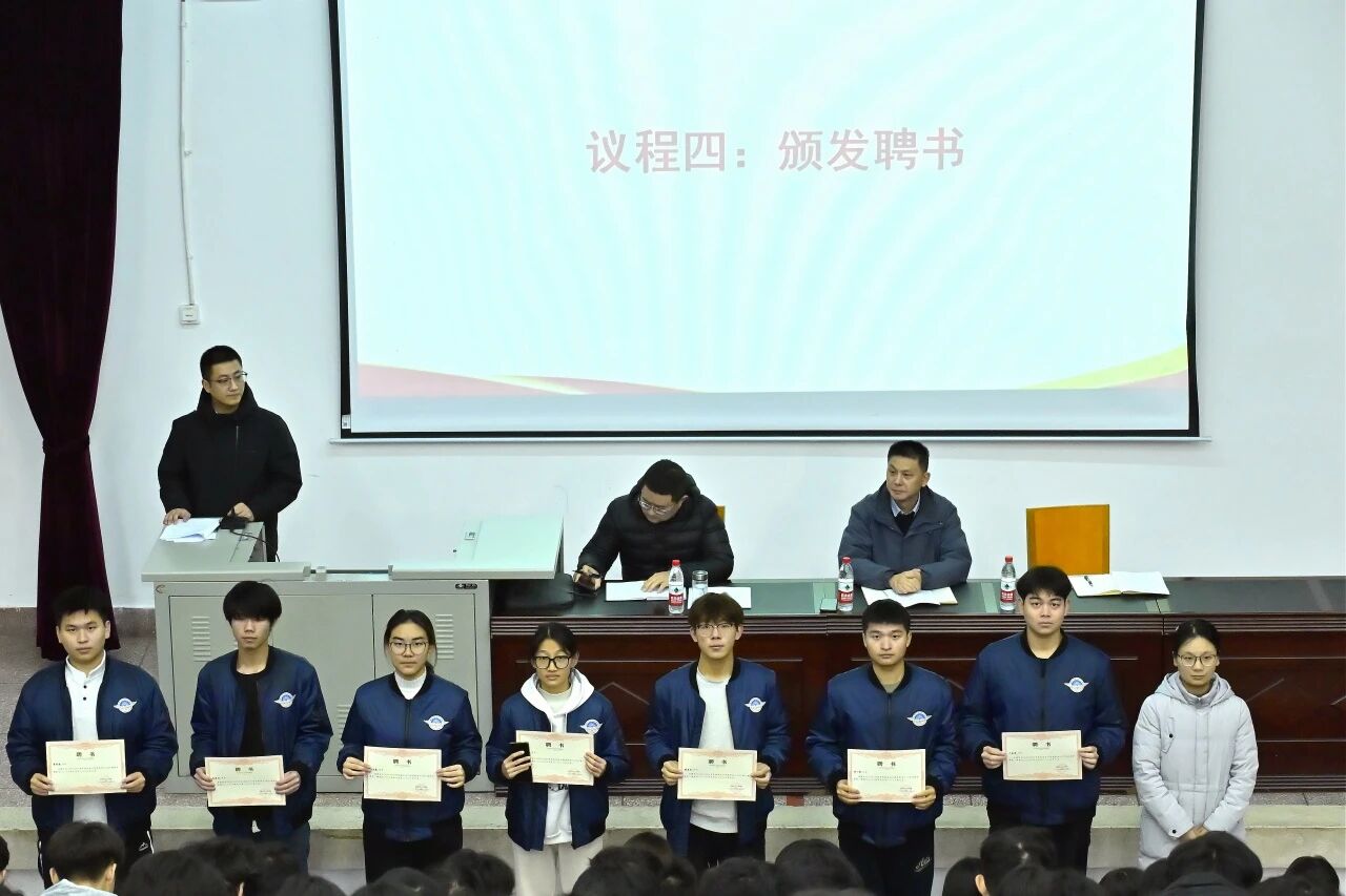 随后,会议报告了2025级学生班级工作总结。韩小波副书记宣读班委聘任名单,团学办李东强、李欣颖老师为新任班委颁发聘书,标志着各班班委正式履新。