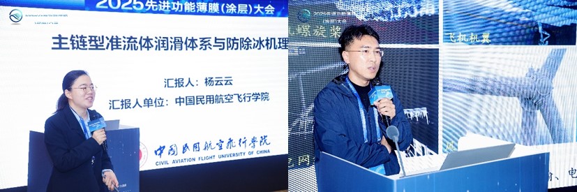 分论坛中,杨云云副教授受邀作分论坛邀请报告,系统阐述了团队在超疏水表面防除冰机制方面的创新成果。许泽华老师在分会场作口头报告,分享了在航空能源材料表面工程领域的实践探索。两位教师的报告内容前沿、数据详实、逻辑严谨,获得与会专家的高度评价与热烈反响。